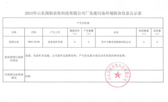 发布时间:2025-10-202024年山东国裕农牧科技有限公司厂危废污染环境防治信息公示表,公司建有危废暂存库;产品的危废全部交由资质的单位管理。