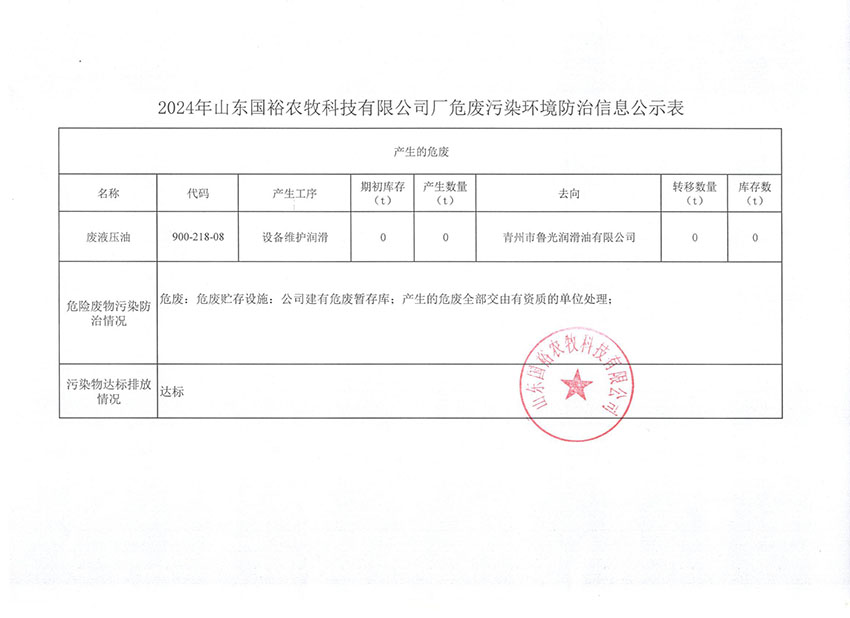 2024年山东国裕农牧科技有限公司厂危废污染环境防治信息公示表